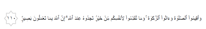 “Dan dirikanlah oleh kamu akan sembahyang dan tunaikanlah zakat dan apa jua yang kamu dahulukan dari kebaikan untuk diri kamu, tentulah kamu akan mendapat balasan pahalanya di sisi Allah. Sesungguhnya Allah sentiasa Melihat segala yang kamu kerjakan.”