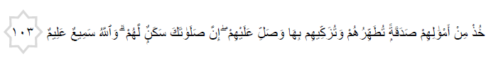 “Ambilah (sebahagian) dari harta mereka menjadi sedekah (zakat), supaya dengannya engkau membersihkan mereka (dari dosa) dan mensucikan mereka (dari akhlak yang buruk); dan doakanlah untuk mereka, kerana sesungguhnya doamu itu menjadi ketenteraman bagi mereka. Dan (ingatlah) Allah Maha Mendengar, lagi Maha Mengetahui.”